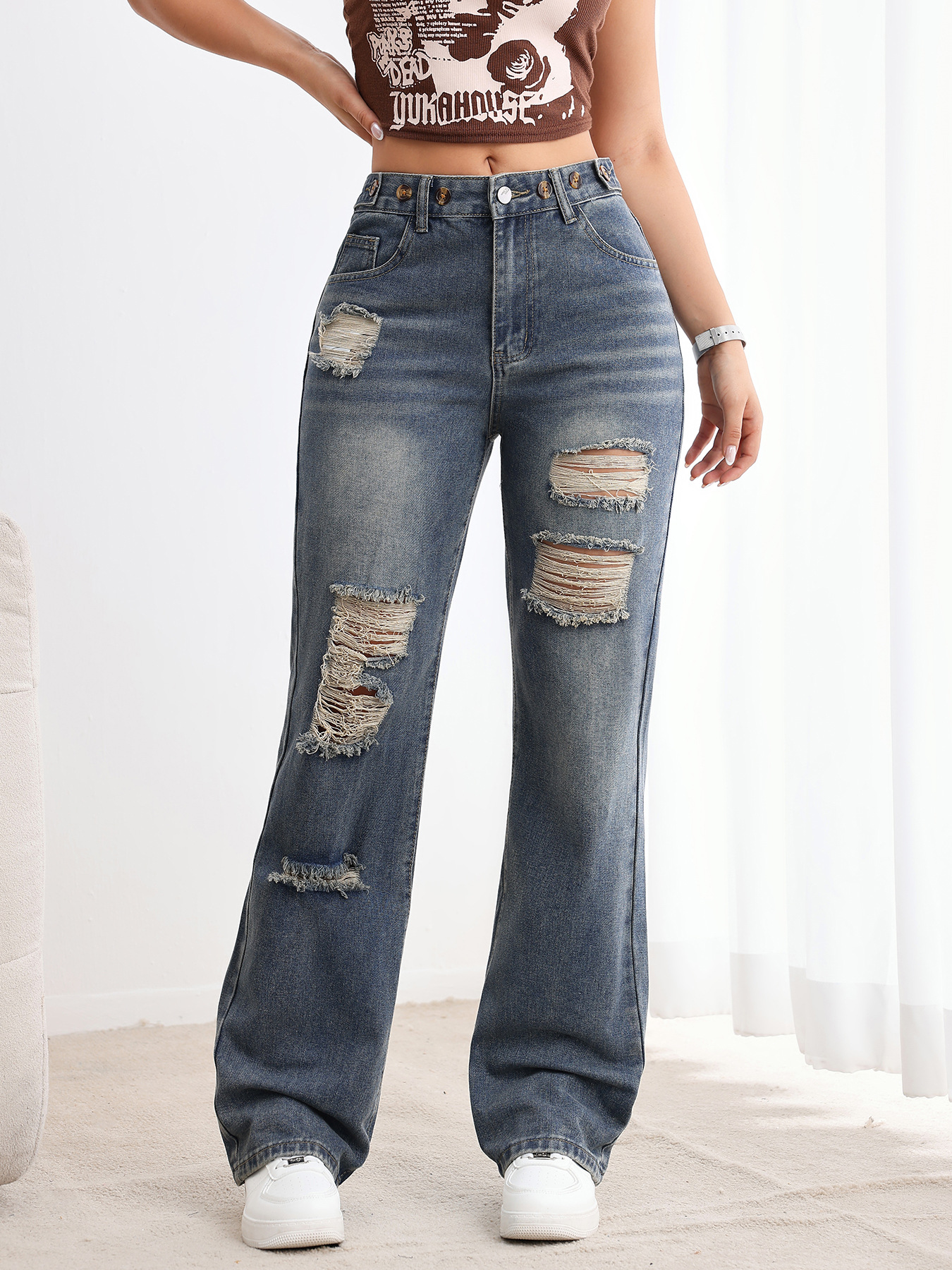 Womens High-waisted Straight-leg Ripped Jeans